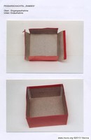 Rote Kartonschachtel mit Ramses-Aufkleber. Im inneren befindet sich ein braunes Ramses-Diaphragma mit Aufdruck: 'Ramses 75 mm'.