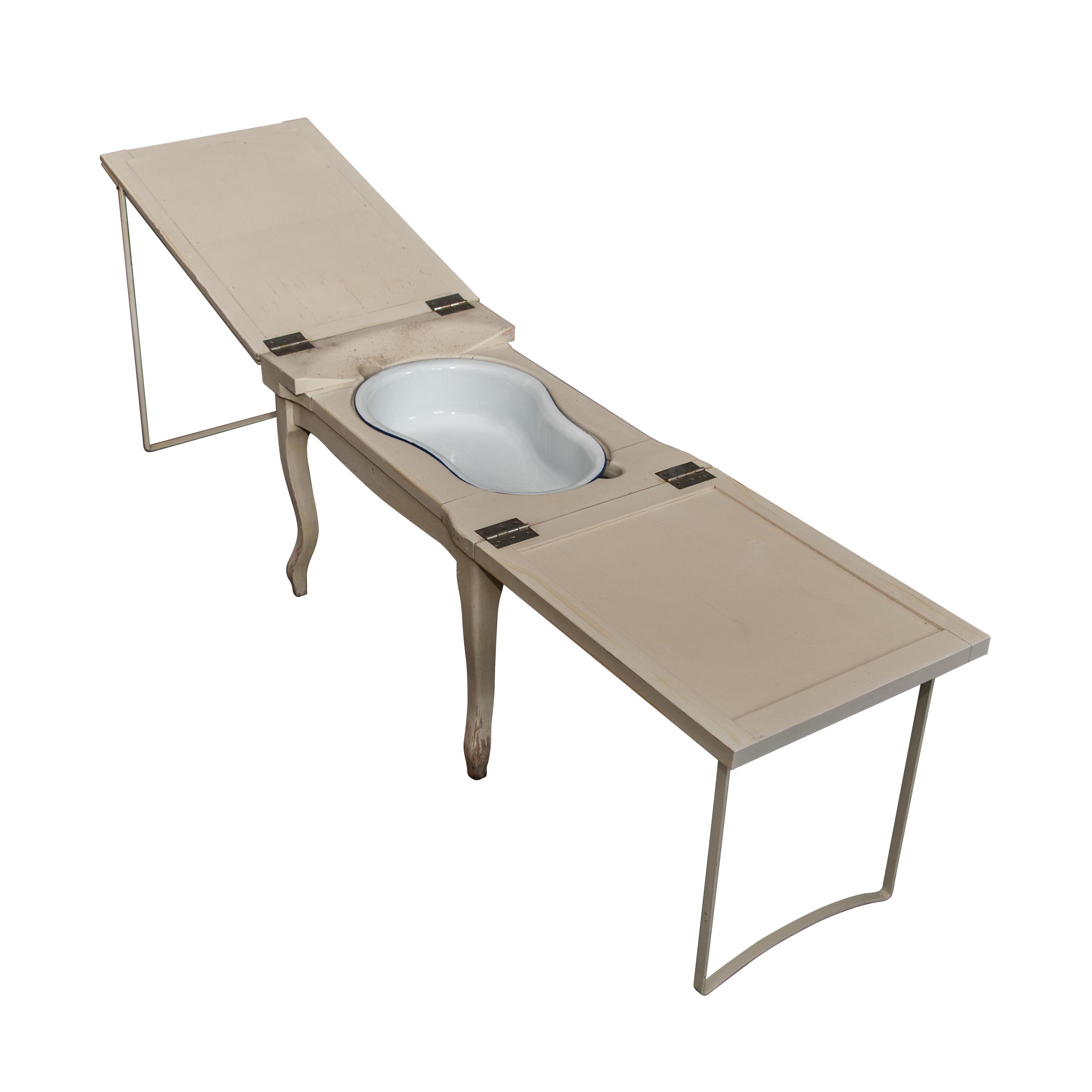 Aufklappbares Bidet aus Frankreich. Von außen wirkt das Objekt wie eine Sitzgelegenheit. Im Inneren befinden sich Schläuche und anderes Zubehör.