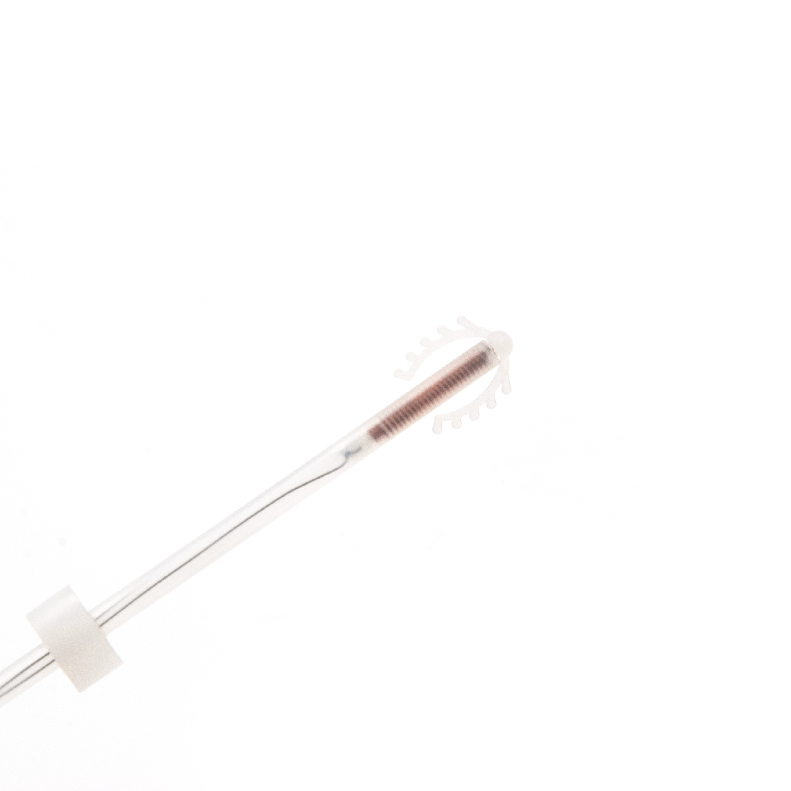 Rundliche Plastikspirale mit jeweils fünf wegstehenden Zäpfchen auf beiden Seiten. Das Mittelstück ist mit Kupfer umwickelt. Eine Gebrauchsanweisung und ein Einführungsrörchen liegen bei. Von einem großen Pillenhersteller zu Marktforschungszwecken gesammelt.