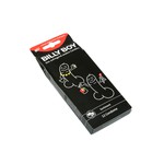 Black snap-open cardboard packet with white inscription and imprint. The back side of the box carries the instruction 'snap open'. In the box, there are twelve condoms in red, green, black and transparent.