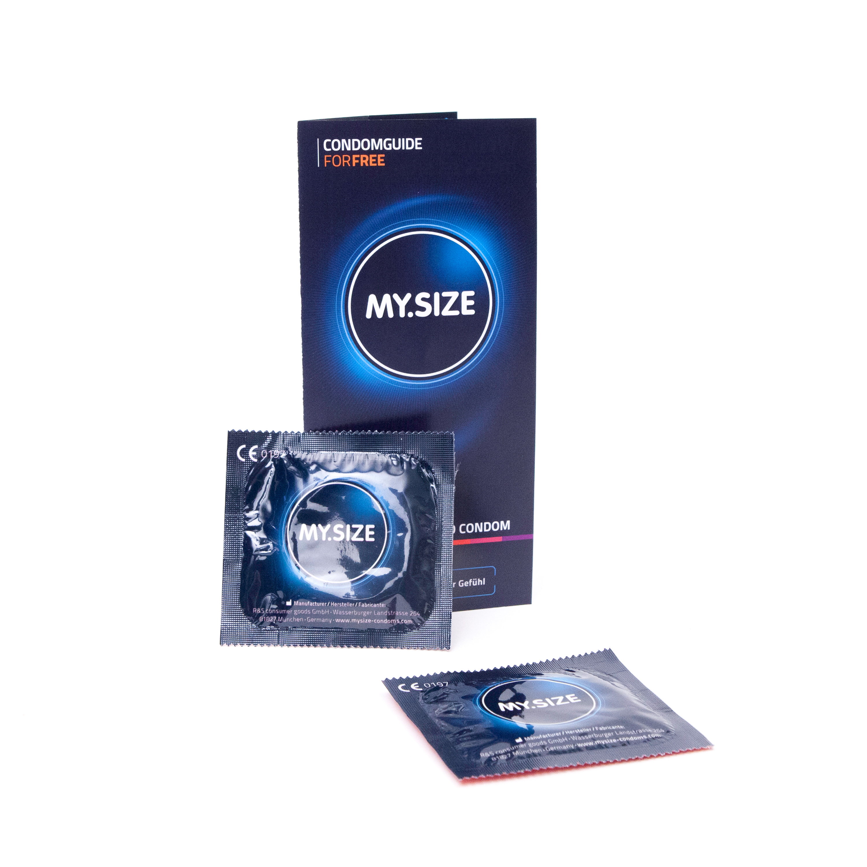 Condoms (vegan) in seven different sizes in blue packaging. Enclosed is a small booklet with a ‘MY.SIZE’ measuring tape. The measuring tape should be carefully wound around the thickest part of the penis to determine the manufacturer’s recommended size.