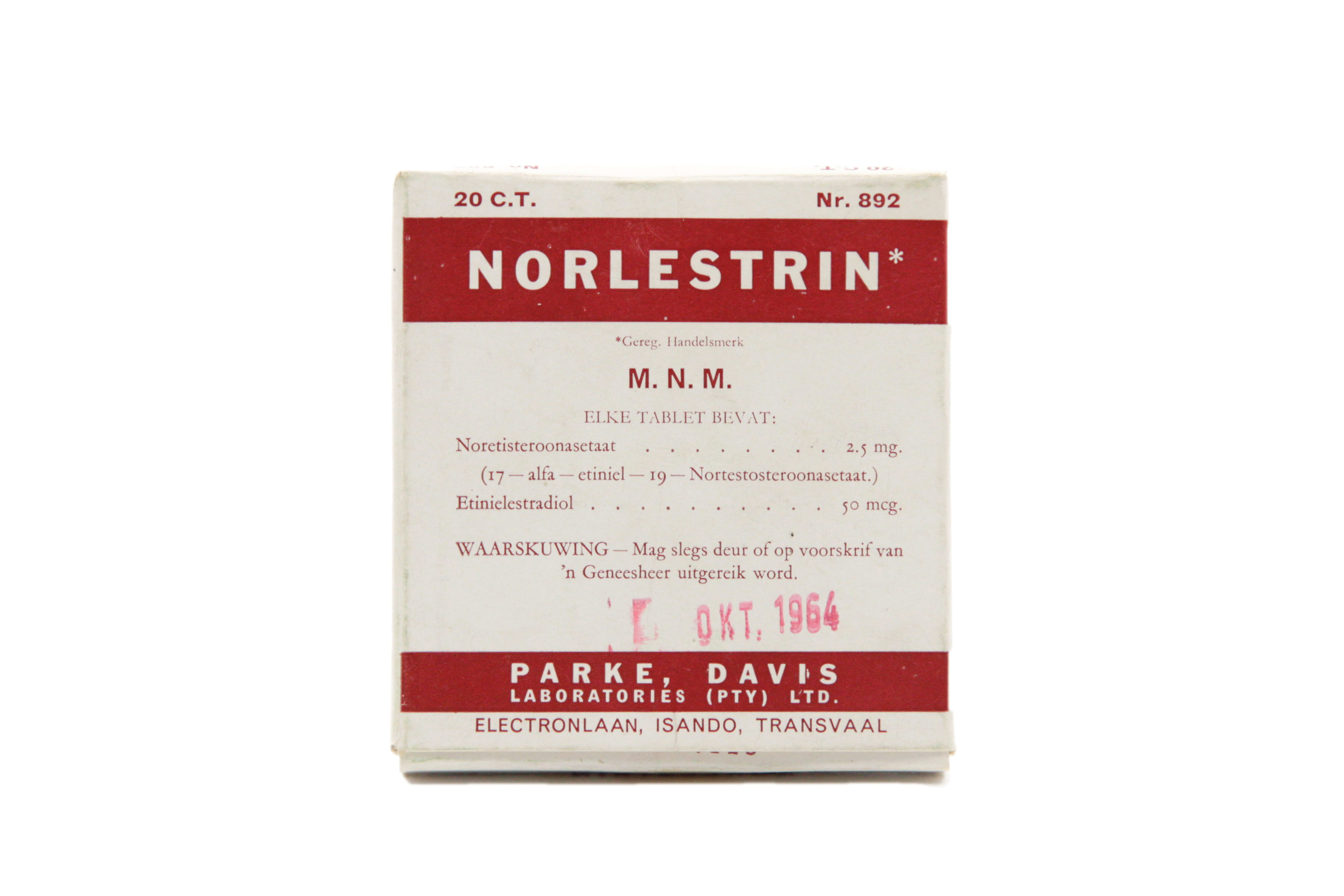 20 contraceptive pills, individually welded. An instruction manual is enclosed. Collected by a major pill manufacturer for market research purposes. Each tablet contains 2,5 mg norethisterone acetate and 0,05 mg ethinylestradiol.