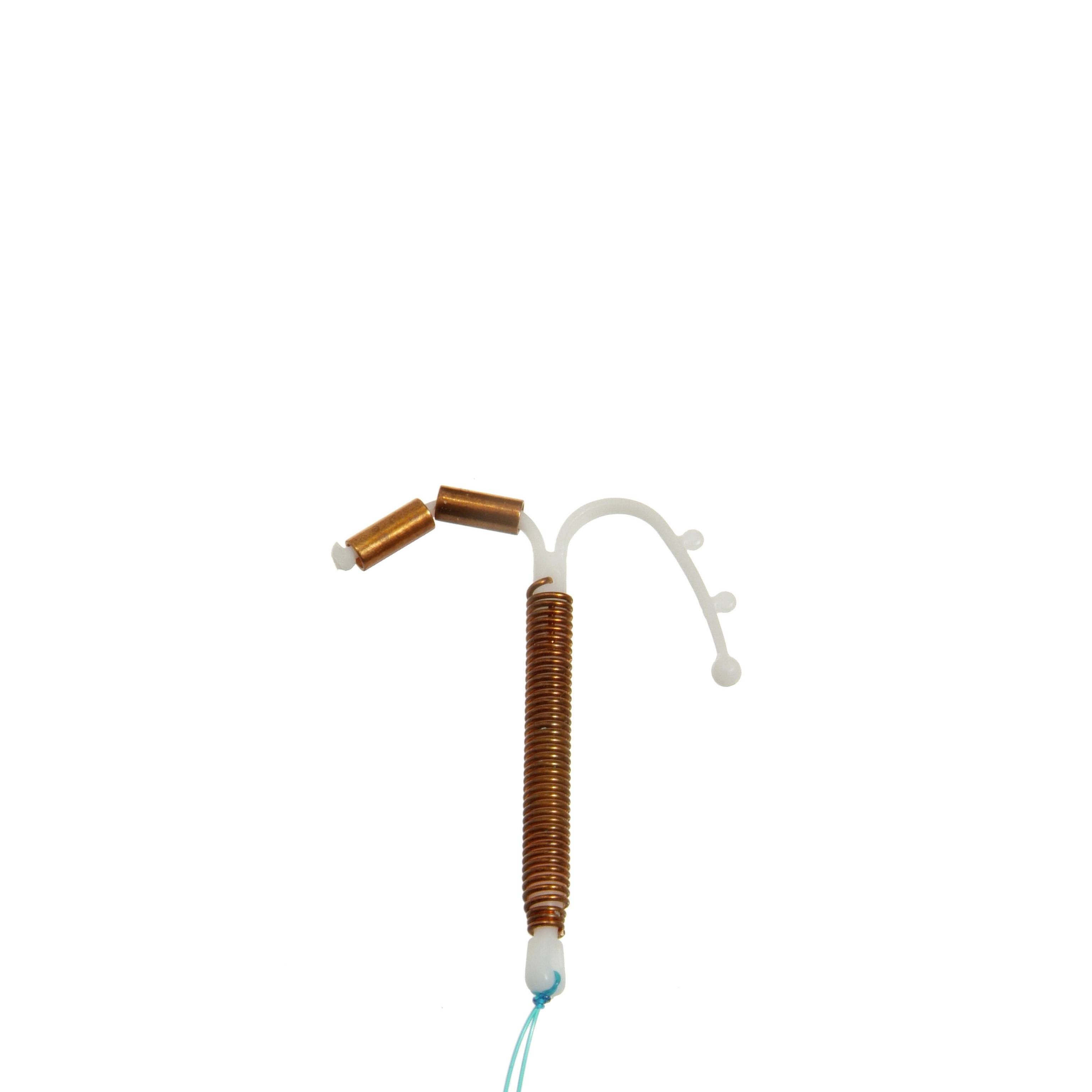 The coil has a rounded M shape. One side has three bobbles, while the other is slightly curved and encircled by 2 copper pieces. The mid-section of the coil is wound around with copper. A blue retrieval thread is attached to the end of the coil.